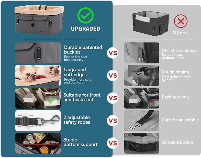 - [Lower Distracted Driving] The dog booster car seat is designed with an adjustable lanyard, a safety clip, and 2 patent buckles to secure the seat and keep it from sliding in the car. And come with 2 upgraded bigger safety ropes to avoid pets jumping out, It lessens the likelihood that you will become distracted while driving.