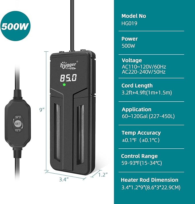 hygger Aquarium Heater,500W/800W/1200W Submersible Fish Tank Water Heater Double Quartz Explosion-Proof with for Freshwater Saltwater Tank