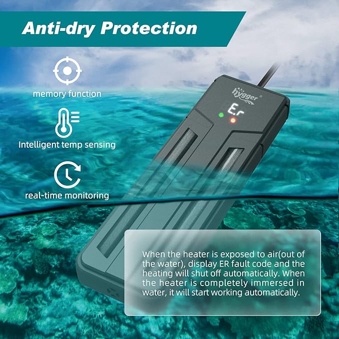 • ANTI-DRY PROTECTION: Intelligent temp sensing, when the heater is exposed to air, display ER fault code and the heater will shut off automatically. When the heating rod is completely immersed in water, it will start working automatically. Effectively extend the service life. It has a power-off memory function and no need to set it again