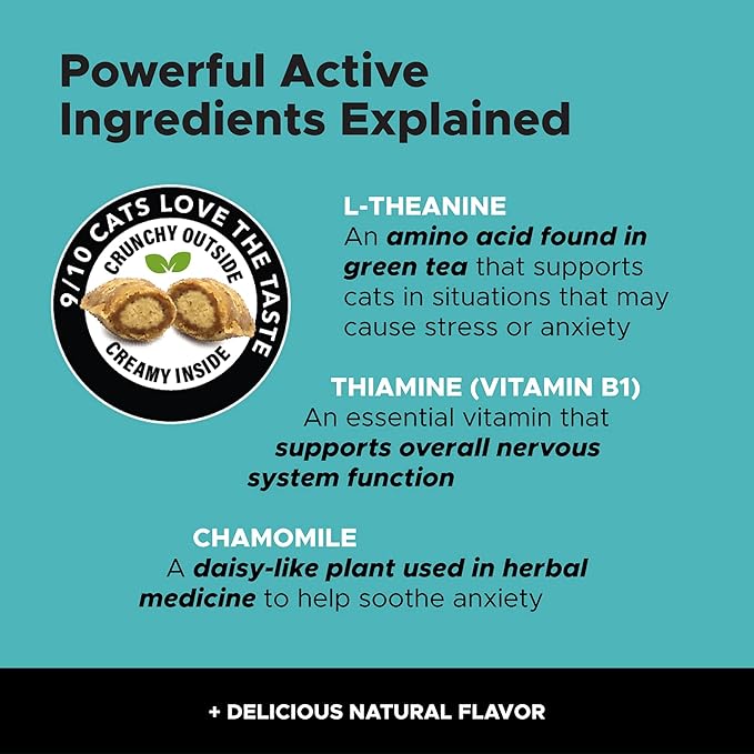 - Made with natural and premium ingredients like L-Theanine, L-Tryptophan, and Chamomile: Calming chews are filled with health-supporting ingredients you can trust. L-Theanine and L-Tryptophan support cats in situations that may cause stress or anxiety. Thiamine is an essential vitamin that supports overall nervous system function. Chamomile is often used in herbal supplement to help soothe anxiety. And they’re all in a delicious chicken-flavored chew your cat will love!