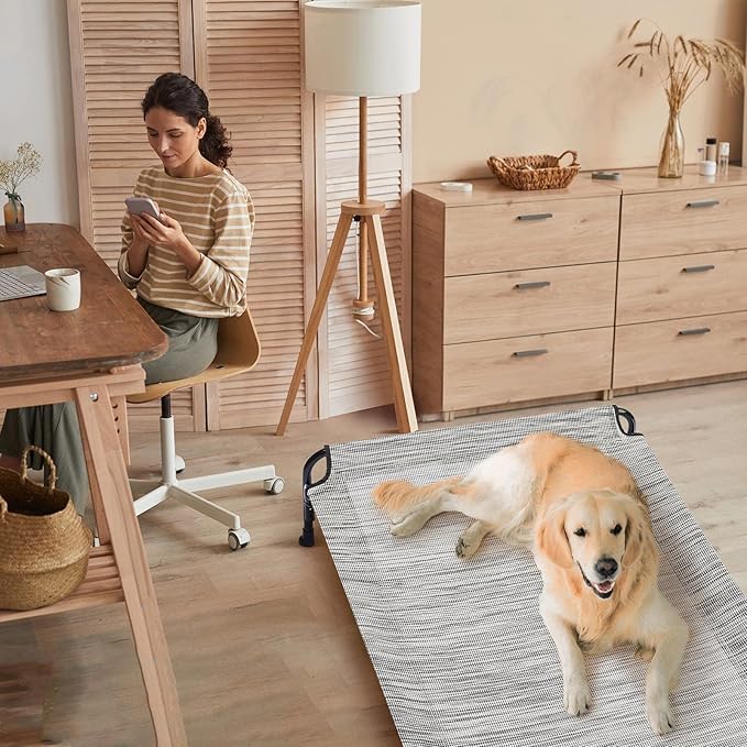 • XL Elevated Dog Bed. Composed of Powder-Coated Steel and Textilene Mesh. 47"L x 32"W x 10.6"H (120x81x27 cm), fits up to 130 lbs(58kg). Suitable for Golden Retriever, Labrador, Rottweilers, Boxers, Huskies, Doberman, Wolf dog etc.
