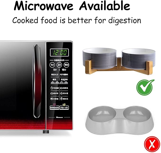 - Double Bowl Design:One dog bowl for food and one for water, Each ceramic cat bowl has a Unique wooden stand, raising the dishes closer to your pet for more comfortable eating