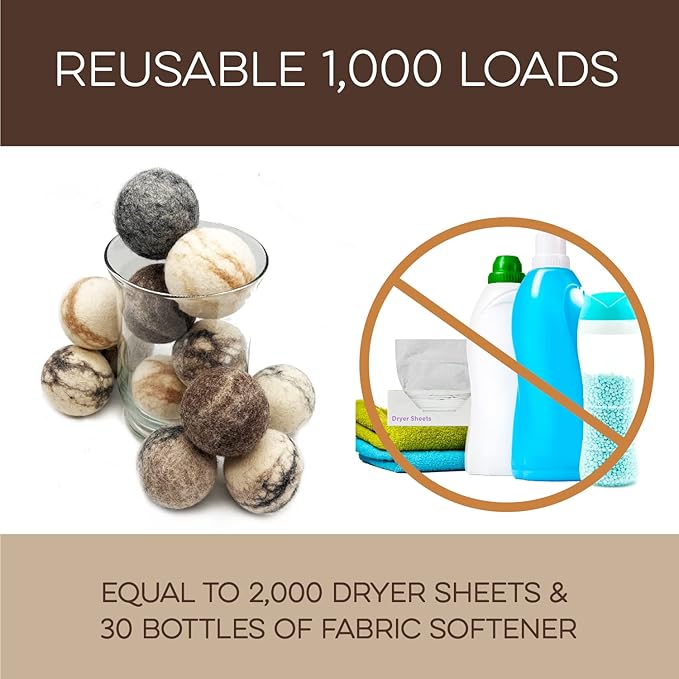 - REUSABLE FOR 1000+ LOADS β REDUCE WASTE: Why keep buying disposable dryer sheets? These cute dryer balls last 1000+ loads, replacing 2000 dryer sheets or 30 bottles of fabric softener. Fluff Ewes dryer wool balls laundry reusable deliver a cost-effective solution for 2-4 years of hassle-free laundry. Make a smarter choice for your wallet and the environment.
