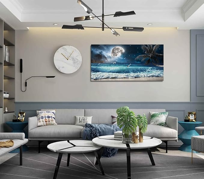 Yxbhhym large Moon Ocean Wall Art Seascape Sea Wall Pictures Canvas Beach Prints Poster Scenery Ocean Paintings Palm Artwork for Bedroom Modern Framed Office Wall Art Living Room Decor-30x60inches