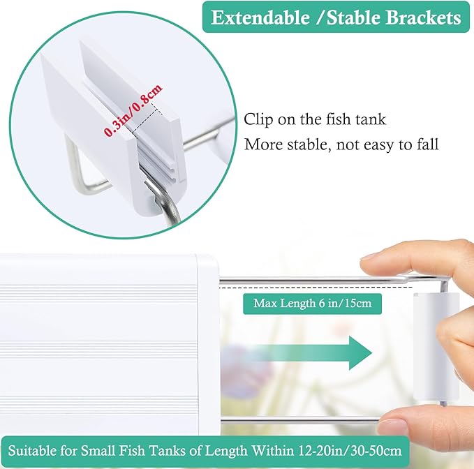 - π¬Extendable/Stable Brackets: The length of the bracket is 6 inches on each end, so the aquarium light can be extended about 4 inches on each end. Unique bracket feet allow the LED light to be more stable on the aquarium, suitable for fish tanks with wall thickness within 0.3 in.