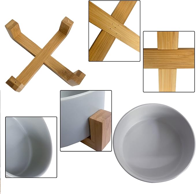 Ceramic Dog Cat Bowl with Wood Stand,Cat Food & Water Bowls Elevated Non-Spill Modern Cute Kitty Dishes Heavy Weighted Round Pet Dishes Set for Small Kitten Grown Cat(Grey)