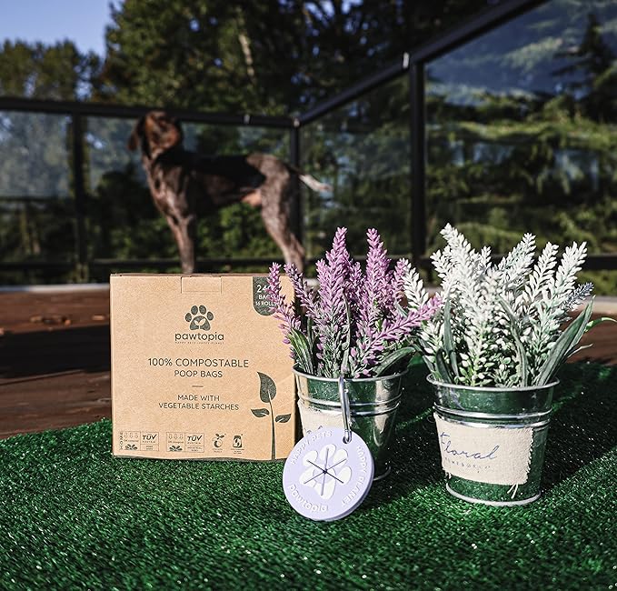 - Purely compostable dog poop bag (240 bags, Lavender bag carrier): Pawtopia supports sustainable living and does not harm the environment. Our biodegradable dog poop bags, made with vegetable starches (corn starch), are 100% home compostable and break down into natural substances such as water, Co2, and biomass. Our biodegradable poop bags are certified with OK Compost Industrial under EN 13432 (equivalent to ASTM6400), and OK Compost Home by TΓΌv Austria under AS5810/ NF T51800.