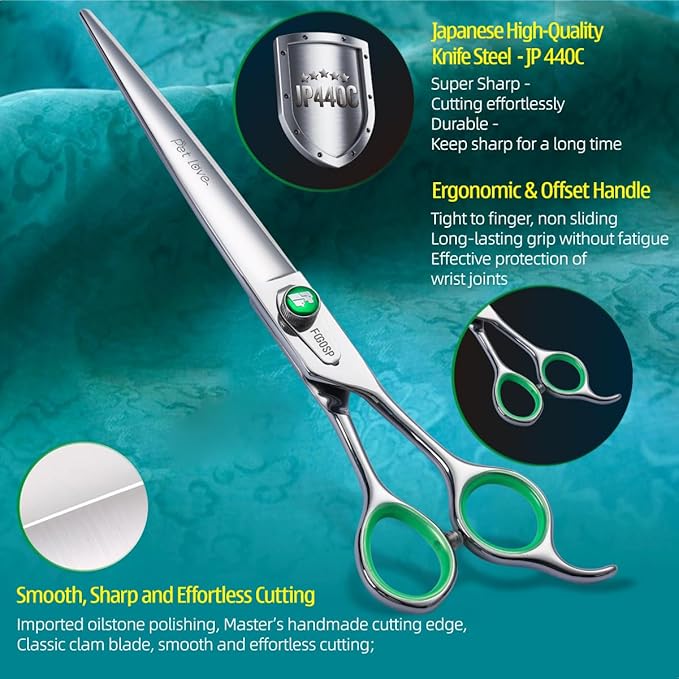 - π[Excellent Quality]FOGOSP dog grooming scissors is made of high quality Japanese 440C stainless steel and is very sharp and smooth that using these grooming scissors is like cutting butter with hot knife. Custom Leaf-Spring Tension Modifier Knob, making more silky smooth to use. Classic low-press offset handle making them comfortable and lightweight to hold, effectively avoid wrist joint injury.Good Tools Make You Enjoy Your Work Even More.
