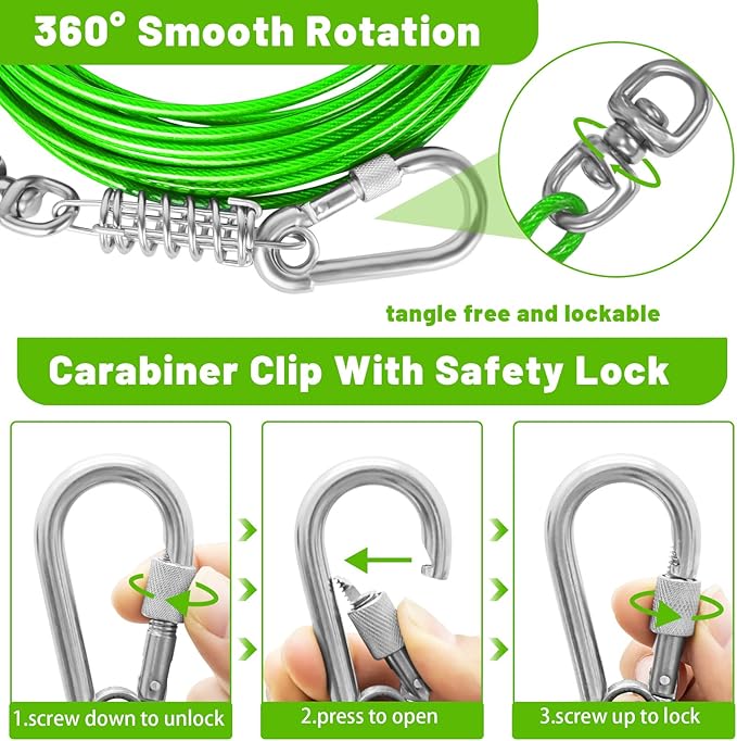 - THE NEWTEST CLIP: The rotating clip can rotate 360 Β°, and the clip is fixed with a ring at the bottom,so that the dog leash will not fall off the hook easily. Provide more space for dogs to move without entanglement. The screw on the swivel hook can lock it to prevent your pet from escaping from the cable and running to dangerous places. pet from breaking free of the cable and running into harm's way.