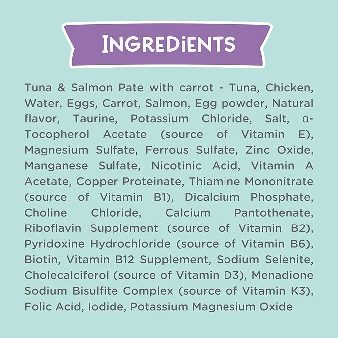 - GRAIN FREE & NON-GMO: Our pate tuna, carrot, & salmon is prepared without any grains, artificial additives, or by-products, as our goal is to feed cats the way nature intended. We always source wholesome ingredients to promote optimal health and nutrition.