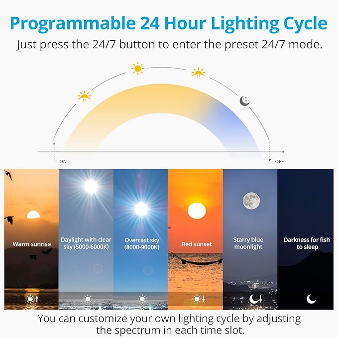 - EASY-TO-USE 24/7 MODE: The fish tank light can perfectly simulate the natural 24-hour cycle of sunlight. Just press a button, hands-free simulating fire red sunrise to blue starry night