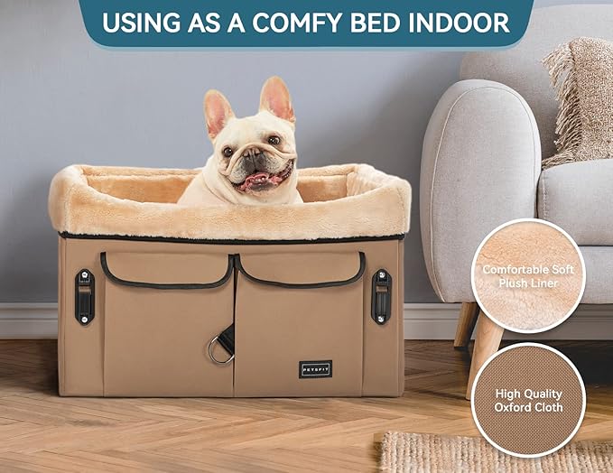 - [Fresh & Comfortable Car Travel] All-around Hollow panels support, keep the whole dog car seat in shape at all times. The cozy plush inner keep your pet quiet and comfortable. And there are 2 storage pockets that can transport the daily needs of pets. Dog seat protects car seats from scratches, hair, and other dirt.