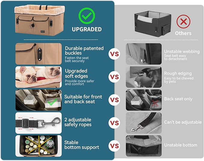 - [Thoughtful Design] The dog car seat is made of sturdy Oxford and comes with a washable pad. The upgraded mat has soft edges, suitable for pets to lay their head over the pet car seat for rest and relieve nervousness or carsick. With the dog booster seatβs window view, your anxious dog can enjoy travel without worry.