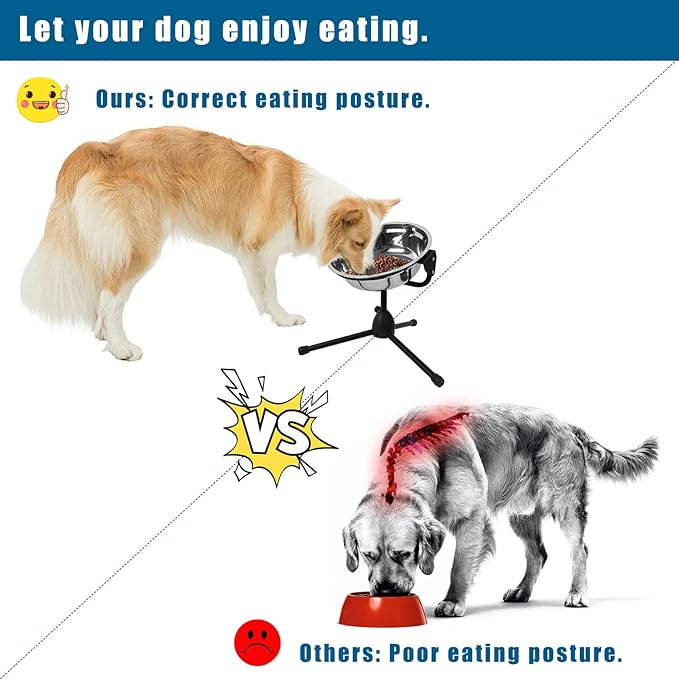 - 【Metal Stand & No-slip Design】This dog bowl set includes a metal stand which is sturdy, durable, and rustproof. The long legs of the tripod stand make the unit more stable. The rubber caps at the ends of the legs prevent the elevated dog bowl stand from moving around on the floor. The plastic tubes on the bowl holder prevent the dog food and water bowl from moving while the dog is eating or drinking. The product is not dog dishes for small dogs, but stainless steel pet bowl for large breed.