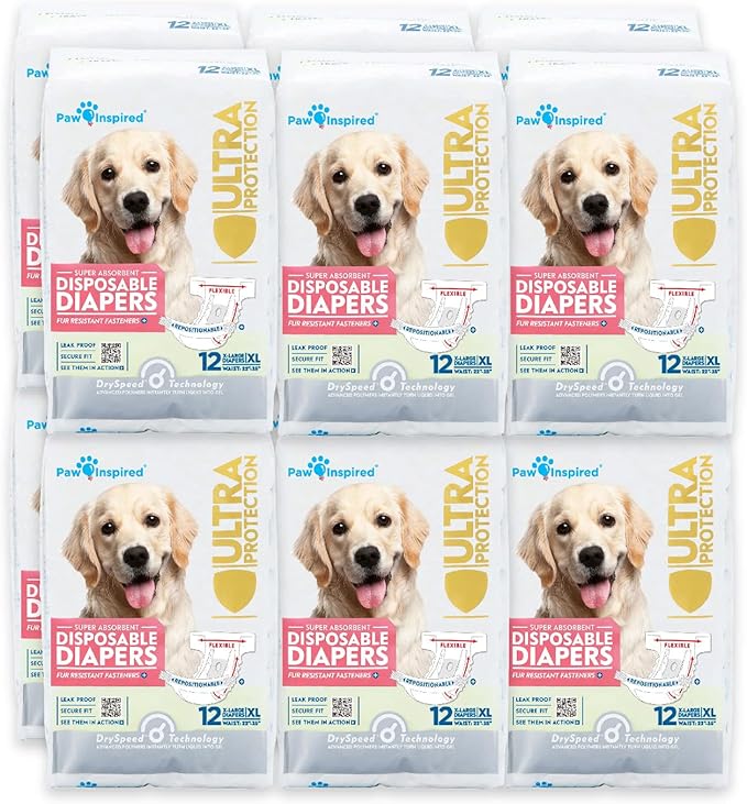 Paw Inspired Disposable Dog Diapers | Female Dog Diapers Ultra Protection | Diapers for Dogs in Heat, Excitable Urination, or Incontinence (12&144 Count) (X-Large (144 Count))