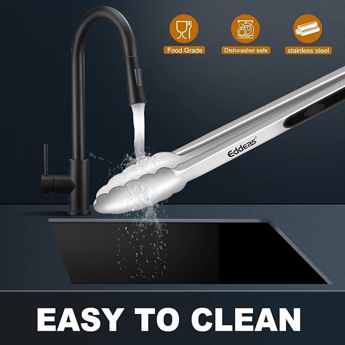 - 【Non-Slip & Heat-Resistant】EDDEAS BBQ Tongs The non-slip silicone grips are heat resistant up to 600°F and offer a secure thumb rest that ensures a comfortable and controlled grip. The stainless steel tong heads are super heat resistant, so you can use them to handle hot food without worrying about melting or warping.