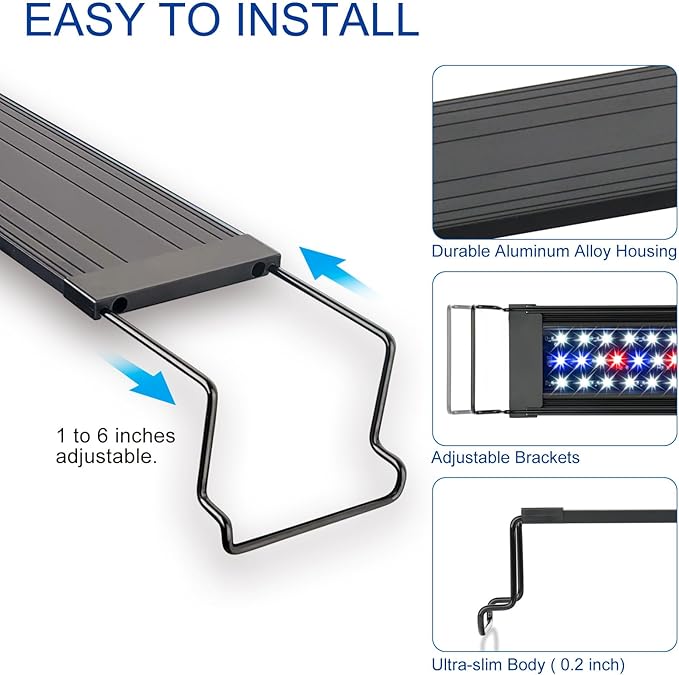 - Ultra Slim Aquarium Light with Extendable Bracket: Sliding brackets allow quick and easy adjustments to fit most rimless and framed aquariums. Each side is 8 inches extendable.