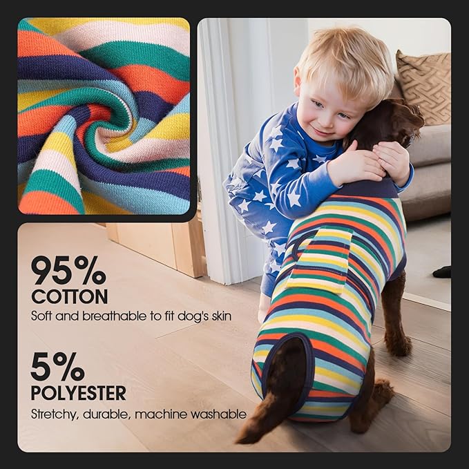 - [BREATHABLE FABRIC]: Our dog recovery suit is made of 95% cotton and 5% spandex. The recovery shirt is highly elastic and breathable, allowing the dog to feel comfortable and move freely after wearing it. No deformation after machine wash.