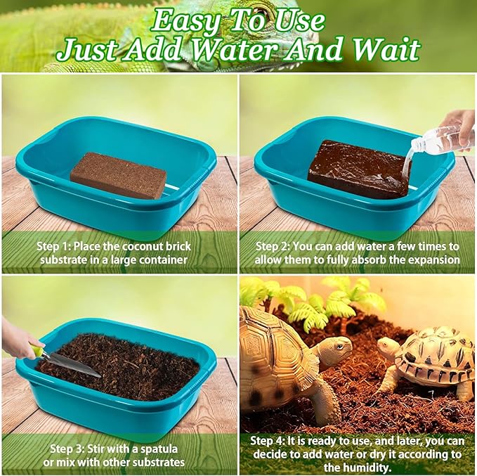 - Easy to Use and Store: These coco bricks are compressed and dense. Just soak the brick in water, coco coir will instantly and easily soak up water and expand into a clean, fluffy substrate. Our Coconut husk fiber is a great substrate for any reptile or amphibian that needs a substrate / bedding that can retain moisture
