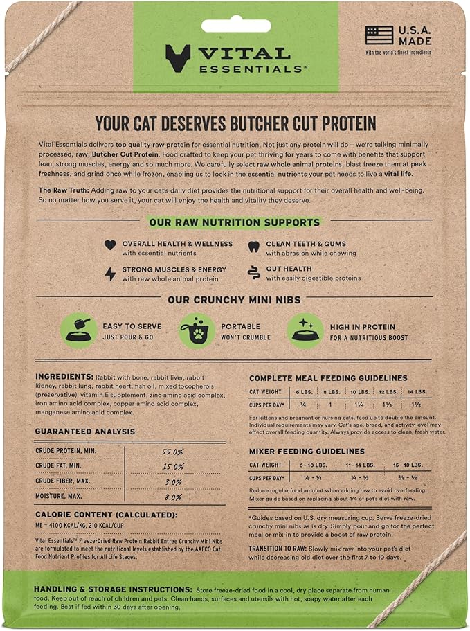 - CRUNCHY FREEZE-DRIED RAW RABBIT CAT FOOD: Vital Essentials Crunchy Freeze Dried Cat Food packs more protein than industry standard into every bite to deliver the peak vitality your cat deserves, especially when compared to dehydrated cat food. This complete and balanced freeze-dried raw cat food is made with premium butcher cut rabbit, responsibly sourced in the EU.