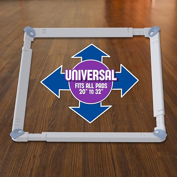 - PATENTED SIZE ADJUSTMENT - The Innovative design of the holder allows for easy adjustment to fit all common pad sizes from 20" to 32." Simply lift the length adjustment tabs and slide to the desired size for a perfect fit. The Pad Genius SureGrip Pee Pad Holder for dogs is 100% compatible with every brand and pad size from 20" x 20" to 32" x 32" and every size and shape in-between! The optional snap-in Pad Genius SureGrip EXTENSION KIT takes the max pad size up to a GIANT 32β x 44," perfect for growing pups or multi-dog households.