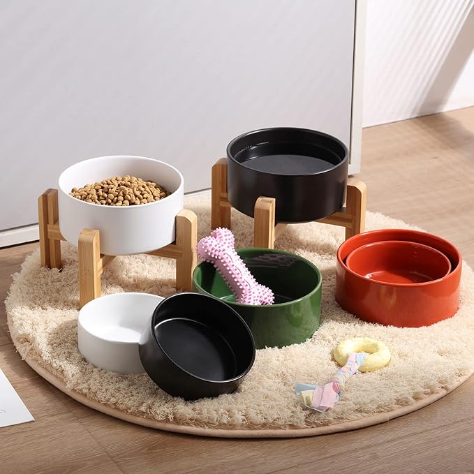 - Easy to Clean and Microwave Safe Ceramic Material - Cute dogs cats bowl with WOOD STAND design matches the home decorations. Ceramic bowl is made of Porcelain, this cat dog food water bowls are free of lead and cadmium. High temperature ceramic, non-toxic harmless, no smell,durable.Clean sanitation, be helpful for pet health. conveniently dishwasher Microwave safe so this ceramic food bowl can be easily cleaned. No Fuss.