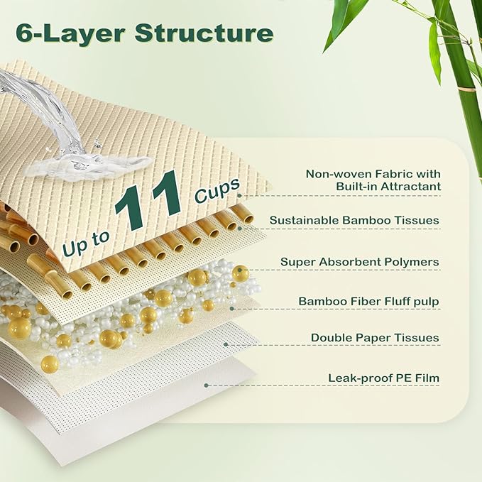 - Natural Odor Eliminating Pee Pads: Bamboo material naturally helps to eliminate unpleasant odors, keeping your home fresh; the pee pads for dogs also include a built-in pheromonal attractant to aid in training dogs to use the pads