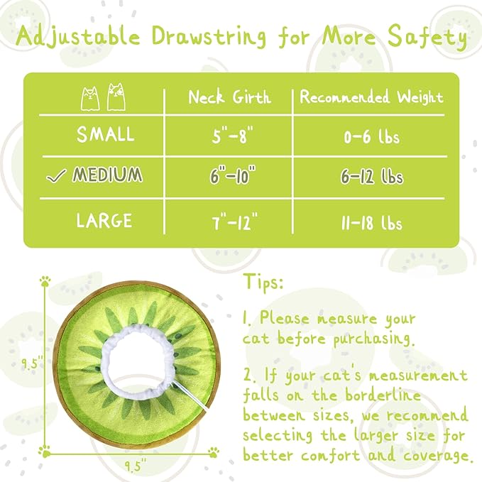 - 【AS AN ADORABLE PILLOW】 More than a cat recovery collar, it’s an adorable decoration for your lovely kitten. It also acts as a soft pillow when the cat lies down. Imagine your cat wearing it and looks like a kiwifruit, you both will be in a good mood all day.