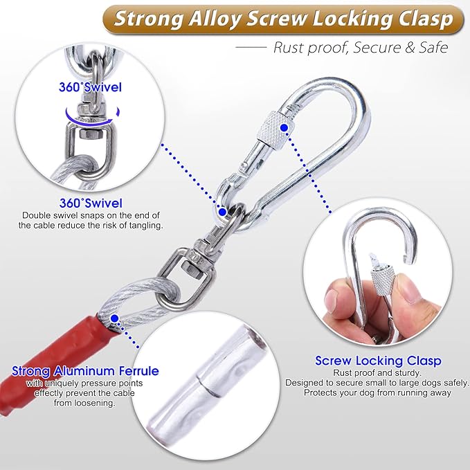 - Heavy Duty Durable Clip: This outside dog leads&chains with 360Β° free rotation sturdy clasp, lightweight, durable and rust-proof. The ends of the dog tie out cable will be easily attached to a spiral ground stake, tree trunk or fence. The twist lock does not tangle the cable and is used to keep pets safe outdoors.