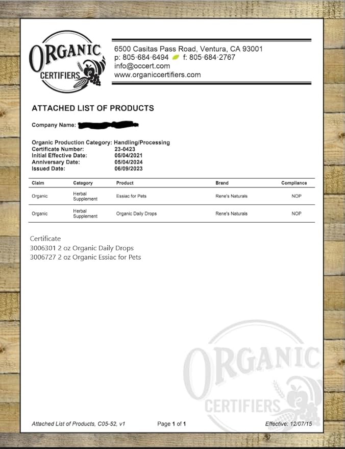 - USDA ORGANIC ESSIAC FOR DOGS AND CATS - The Classic Essiac herbal supplement formula is now available in a convenient concentrated daily drop meant for our beloved companions. The new plastic dropper format with graduated dosage pre-printed makes it easy to give and Alcohol Free. Each 2 fl oz. (59ml) bottle provides up to a 2-month supply.