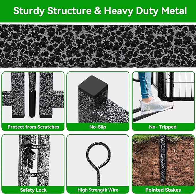 - 【Sturdy Structure & Stable Ground Stakes】Kfvigoho metal stakes are designed round top, which can be pounded into the ground for greater stability, this dog fence with sturdy structure, so dogs can't knock it down and keep them confined in a safe area, the pet pen works great for small, medium and large dogs and rabbits, ducks, turtles etc