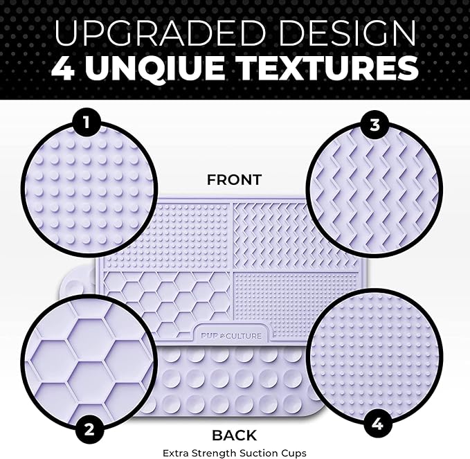- 4 BRAIN STIMULATING PUZZLES. Each rectangle integrates a different pattern that teaches your pet foraging and patience while doubling as a fun dog toy. Perfect for wet and dry dog food, treats, or peanut butter, this USA-designed lick pad will keep your doggy’s mind sharp and provide a challenge while he eats. The smaller the grooves, the higher the difficulty— which means more mental enrichment for your furry friend to learn.