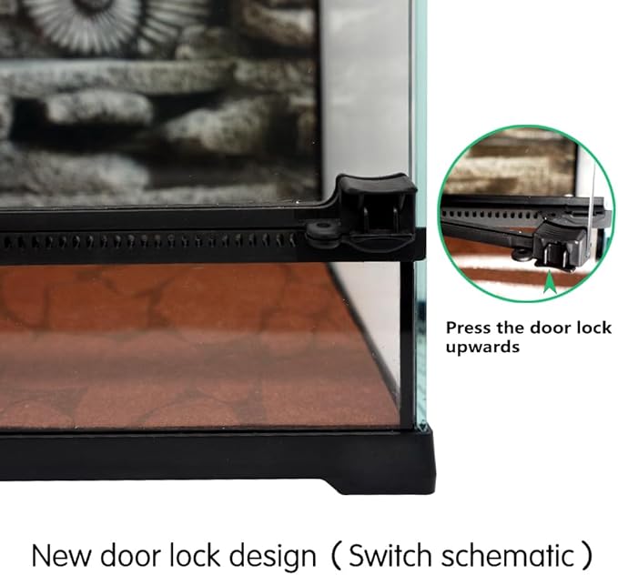 - 【Compact Design Mini Glass Terrarium】: Made of premium thick glass base for extra safety. The front door opens with one hand separately, making this reptile terrarium easy to access and easy to clean, decorate and maintain. Specially designed locks also help prevent escapes