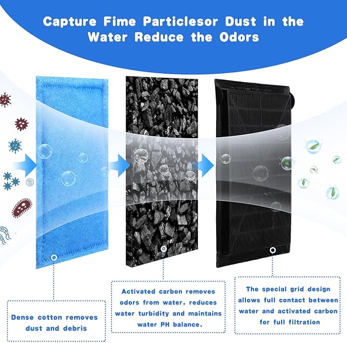 - Nice Performance: our filters for fish tank features with dense filter cotton, which absorb all kinds of debris and fish manure; The mesh design of aquarium filter enables the maximum contact between activated carbon and water to achieve the maximum degree of deodorization and purification of water quality; Meanwhile, Save your energy and time in cleaning