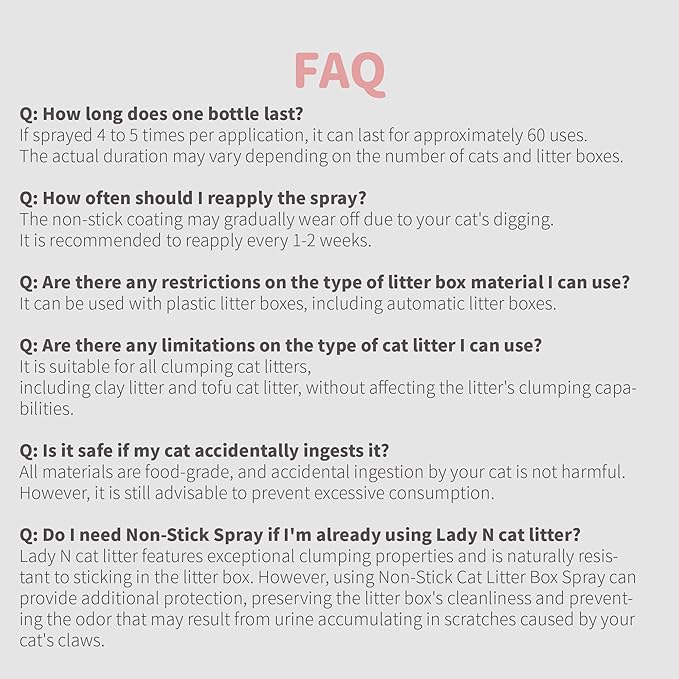 - Long-Lasting Solution: A single 6 fl oz bottle of Lady N Non-Stick Spray delivers over 60 applications, providing six months of worry-free maintenance for a household with two cat litter boxes. Enjoy a consistently clean space with fewer applications needed.