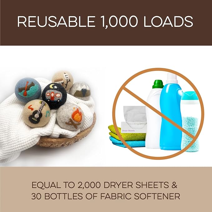 - ADORABLE DESIGNS - A THOUGHTFUL GIFT FOR ANY OCCASION: Bring adventure to your laundry day with this playful set of wool dryer balls. It includes a Guitar, Camper, Mountains, Camp Fire, Sβmores, and a Boat/Canoe, all neatly packaged in a reusable linen drawstring storage bag, theyβre ideal for gifting at baby showers, housewarmings, or as a fun surprise for someone special. These cute and practical dryer balls are sure to delight everyone!
