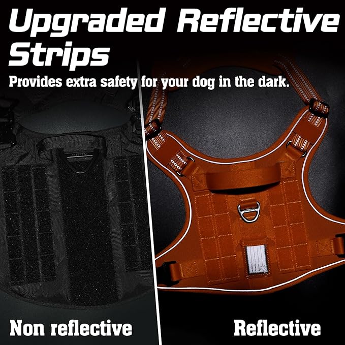- Ultra Safety Design: The reflective trims all around the tactical dog harness for optimal visibility and security at night. Two secure metal leash attachments for different occasions. Daily back clip for well-trained dog's casual walking or jogging. No-pull front clip helps discourage your dog from pulling