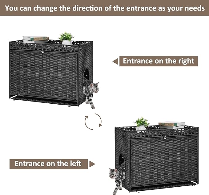 - 【Multi-functional cat house】This Bohemia style cat crate adds a warm and rustic element in the house. The hidden litter furniture is built with environmentally friendly rattan material, which is not afraid of sunlight and can be used on the balcony. You can add a cat bed inside for a cozy cat house, or top it off with lovely plants to enliven your home. In addition, it can be used as a nightstand or side table.