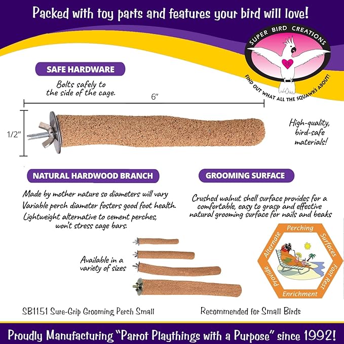 - EASY TO CLEAN: Maintenance is hassle-free with the Sure-Grip Grooming Perch. Wipe clean as needed to ensure a hygienic and inviting perching area for your feathered friend. Enhance your bird's living space with the Super Bird Creations Sure-Grip Grooming Perch where comfort, grooming, and foot exercise come together in one delightful package.