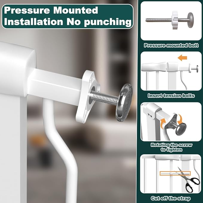 - Pressure mounted, no damage to the wall - Installing this pet gates for doorways no drilling is a breeze! The pressure-mounted system ensures easy setup without the need for tools, leaving your walls damage-free. Simply position the pet gate inddor where needed for a secure barrier for your little ones