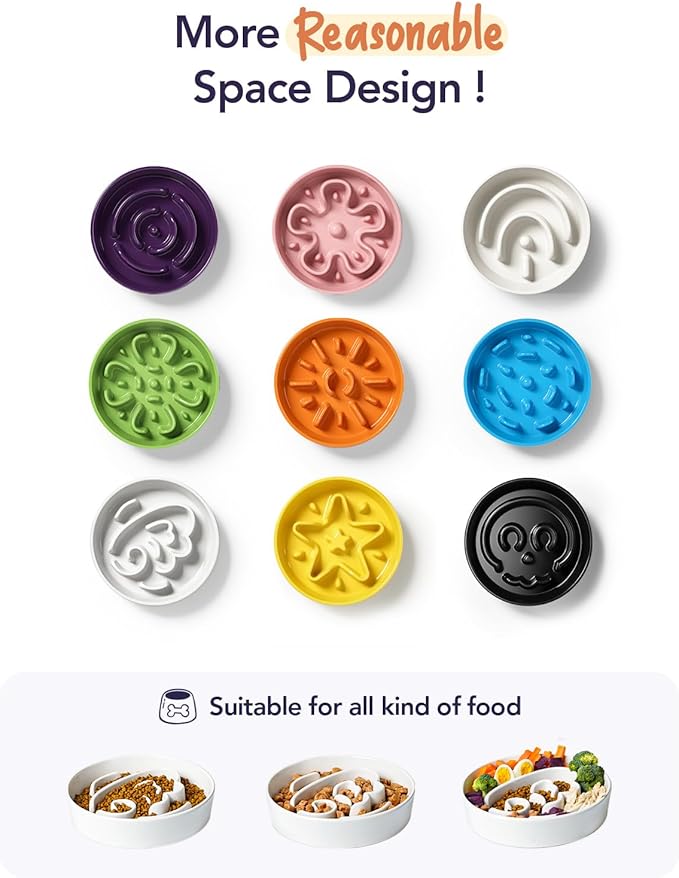 - Slow Down Eating, Bring Dog A Healthy Diet: Fast-eating dogs experience bloat, regurgitation, and obesity easily. Our slow feeder dog bowl design with the ridges and maze pattern helps your dog to eat slower than 52 times. Your dog could change his overeating behavior through a challenge and fun mealtime