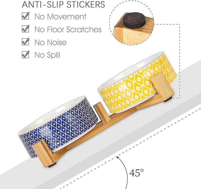 Selamica Ceramic 14 OZ Dog Bowls, Dog Food and Water Bowls with Wooden Stand, Anti-Slip Dog Dishes Set for Cats & Small Dogs, Weighted Pet Bowls Set of 2, Assorted Color A