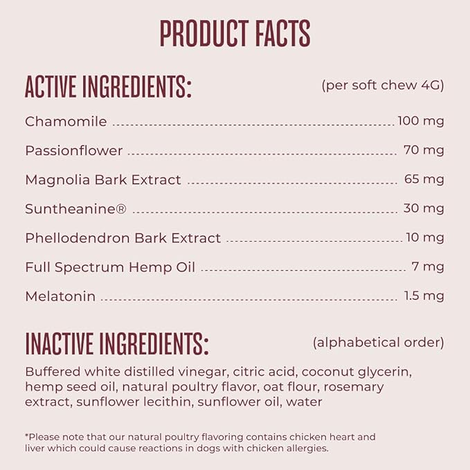- NATURAL INGREDIENTS FOR A CALMER PUP: Witness your pet’s new relaxation, balanced behavior, and improved sleep with our naturally occurring ingredients. Melatonin, Suntheanine, and Passionflower work to enhance the neurohormones and neuro-inhibitors in your dog’s brain.