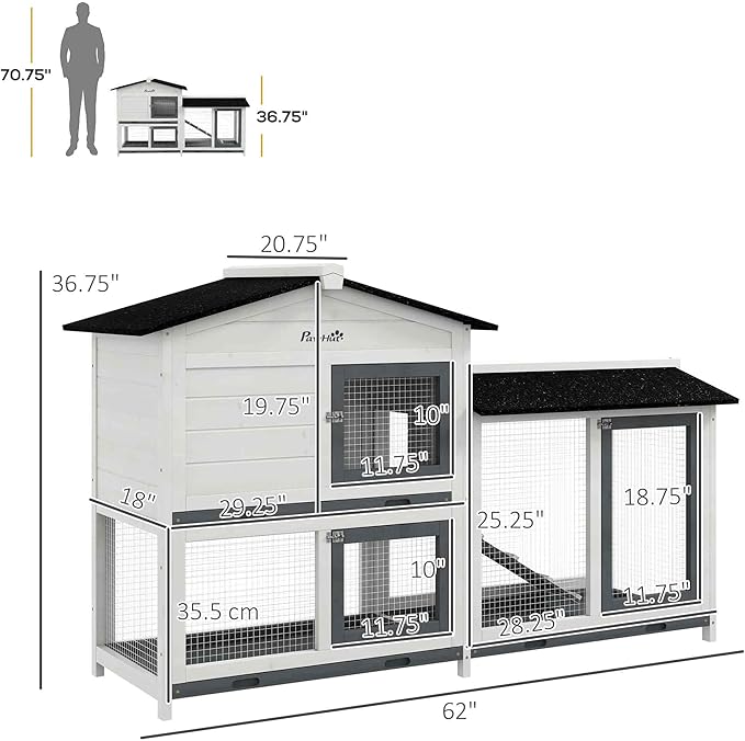 - Rabbit Cage Information: Overall Dimensions: 62" L x 20.75" W x 36.75" H. Main House Dimensions: 29.25" L x 18" W x 19.75" H. Assembly Required.