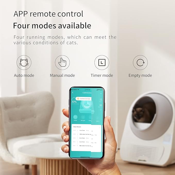 - 𝟰 𝗖𝗹𝗲𝗮𝗻 𝗠𝗼𝗱𝗲𝘀: Auto Mode, Manual Mode, Timer Mode, and Empty Mode are available with remote app control or panel control. In addition, the empty mode is convenient for changing all cat litter and cleaning the globe.