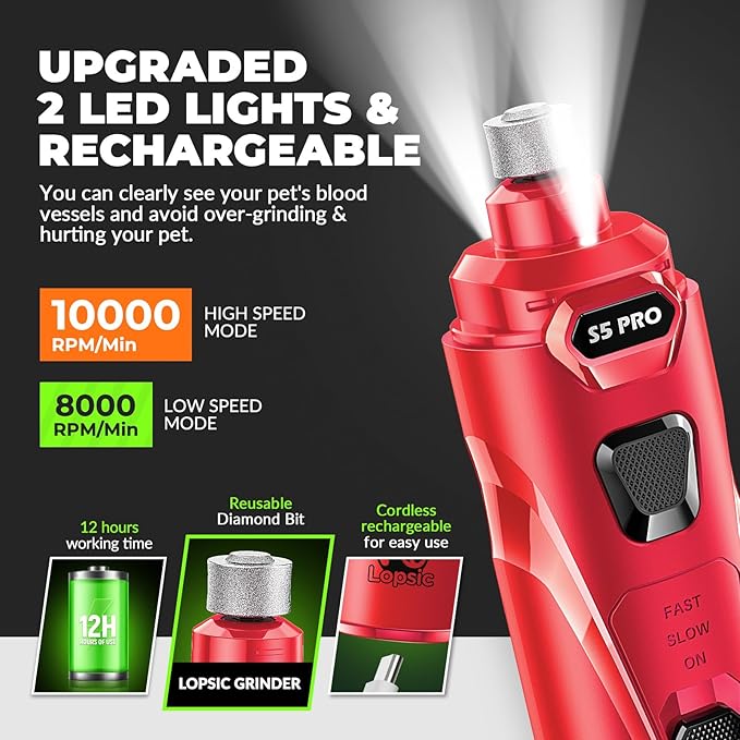 • 【Improved Precision: 2 LED Lights & Adjustable Speeds】: LOPSIC dog nail grinder for dogs features 2 LED lights that offer clear visibility of the quick, ensuring precise and safe nail trimming for your pets. The adjustable speeds(8,000 RPM to 10,000 RPM) of dog nail trimmers can adapt to small, medium and large pets nail trimming needs. When using the dog nail trimmers at the proper speed, pet nails of different hardness can be efficiently ground.