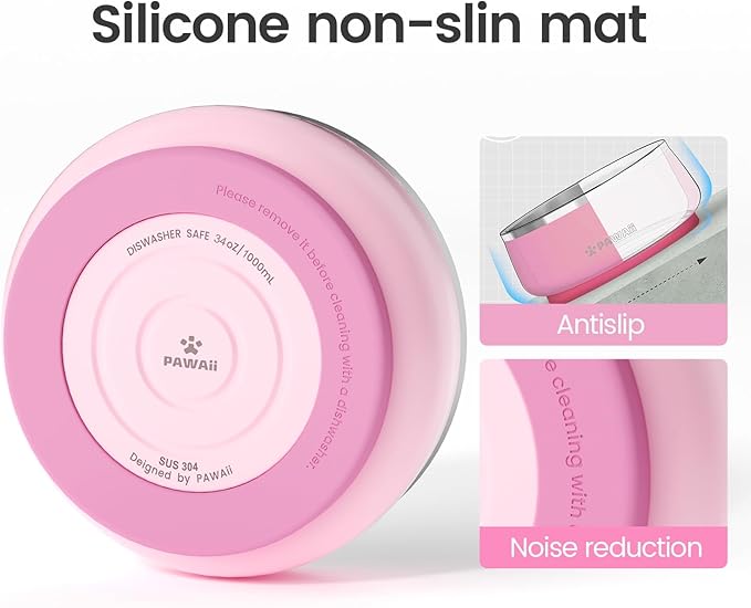 Pawaii Stainless Steel Dog Bowl with Non-Slip Rubber Base & Double Wall Insulation - Durable Design | Includes ID Tag | Dishwasher Safe Food & Water Bowl for All Dogs (34oz)