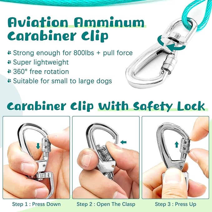 - Durable Superior Clip: The dog leads for outside has 360Β°free-rotating clip, which is lightweight, durable and rust-proof. Both ends will be easily connected to the ground pillar or screw pile. The spiral ring lock is used to ensure petβs outdoor safety.