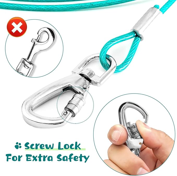 - Durable Superior Clip: The dog leads for outside has 360Β°free-rotating clip, which is lightweight, durable and rust-proof. Both ends will be easily connected to the ground pillar or screw pile. The spiral ring lock is used to ensure petβs outdoor safety.
