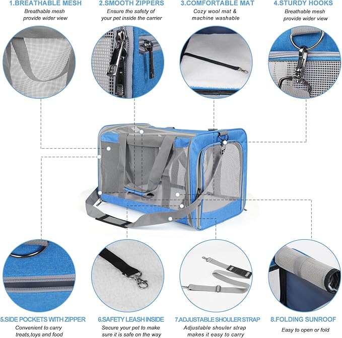 Pet Carrier for Large Cats of 20 Lbs, Collapsible Carrier Bag for Big Cat or 2 Kittens,Soft Sided Puppy Carrier with Sturdy Travel Transport Strap, Adequate Ventilation, 4 Mesh Windows (Blue)